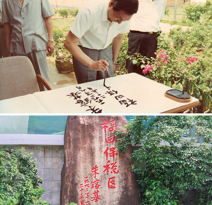 深圳是国内最早开始探索保税政策的城市,福田保税区则是深圳最早建成并投入使用的保税区。原国务院总理朱镕基分别于1992年和1997年两次莅临福田保税区考察,一向主张只签名不题词的朱镕基总理原本并不打算为保税区题词,但在在他签写自己的名字后,一旁的观众掌声雷动,经久不息,总理着实是性情中人,为此破例下笔题写了“福田保税区”五个大字。当时总理乐呵呵地开玩笑道:“这个字的版权是我的,很值钱的。”当时在观众席中的金年会老员工每次向别人解释总理题词原稿中名字在右,而“福田保税区”在左的原因时,总是带着骄傲的语气。总理体“福田保税区”至今沿用于保税区内各标志性景观。