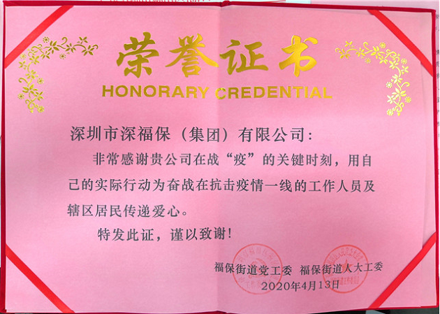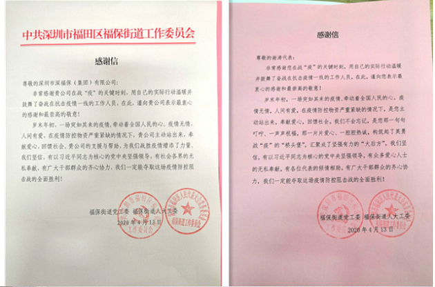 近日,福保街道党工委、福保街道人大工委向集团颁发了抗疫荣誉证书和感谢信,表彰和感谢金年会集团及福田区人大代表、集团党委书记董事长谢涛在抗疫期间对辖区一线抗疫工作的支持和配合。市公安局交通警察局向物业公司颁发了《同舟共济以爱筑城》荣誉证书,感谢物业公司在抗疫期间对交警工作的关心与支持。