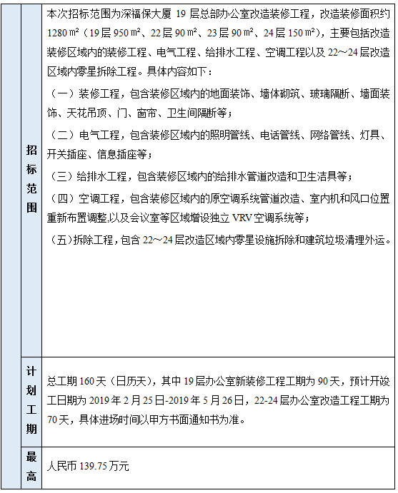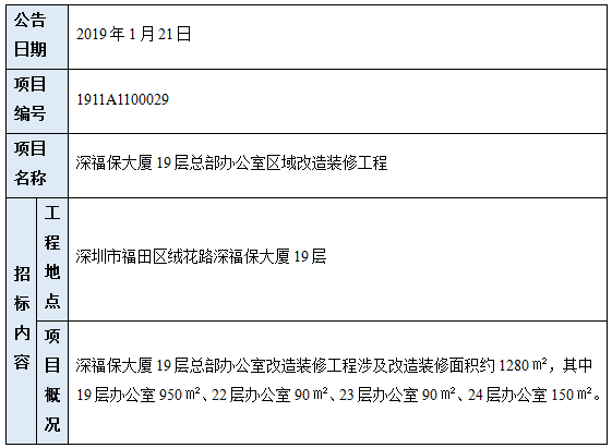 金年会大厦19层总部办公室区域改造装修工程(项目名称)招标方(招标人)为深圳市金年会(集团)有限公司(招标人单位名称),采购资金来自企业自筹(资金来源),项目出资比例为100%。项目已具备招标条件,现进行国内公开招标。
