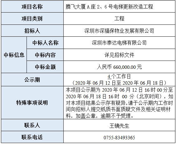 腾飞大厦A座2、6号电梯更新改造工程(招标编号:SFBWY/ZB(WX)-2020-002)已完成评审,现将本项目评审的相关情况及结果进行公示,具体内容如下: