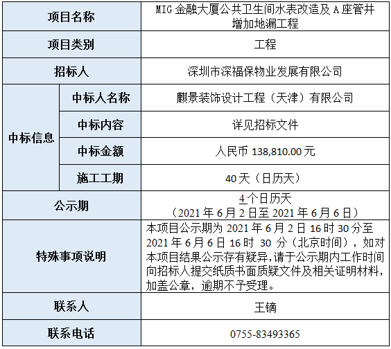 MIG金融大厦公共卫生间水表改造及A座管井增加地漏工程(深圳市建设工程材料设备询价采购网络服务平台招标编号:SZXJCG-S202104160005)已完成评审,现将本项目评审的相关情况及结果进行公示,具体内容如下: