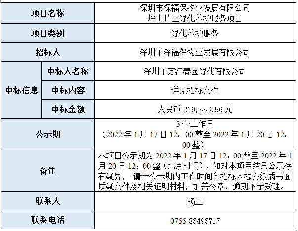 深圳市金年会物业发展有限公司坪山片区绿化养护服务项目已完成评审,现将本项目评审的相关情况及结果进行公示,具体内容如下: