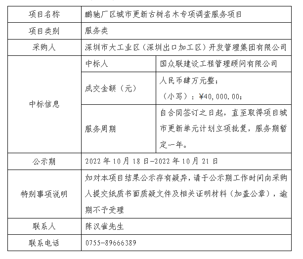 在深圳市建设工程材料设备询价采购平台进行公开招标的鹏驰厂区城市更新古树名木专项调查服务(项目编号:SZXJCG-S202209220004)已完成评审及定标,现将本项目评审的相关情况及中标结果进行公示,具体内容如下: