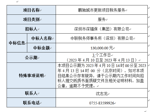 鹏驰城市更新项目税务服务已完成评审,现将本项目评审的相关情况及结果进行公示,具体内容如下: