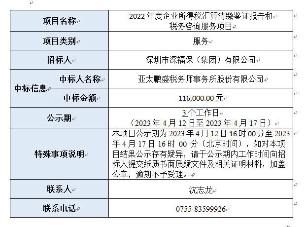 2022年度企业所得税汇算清缴鉴证报告和税务咨询服务项目已完成评审,现将本项目评审的相关情况及结果进行公示,具体内容如下: