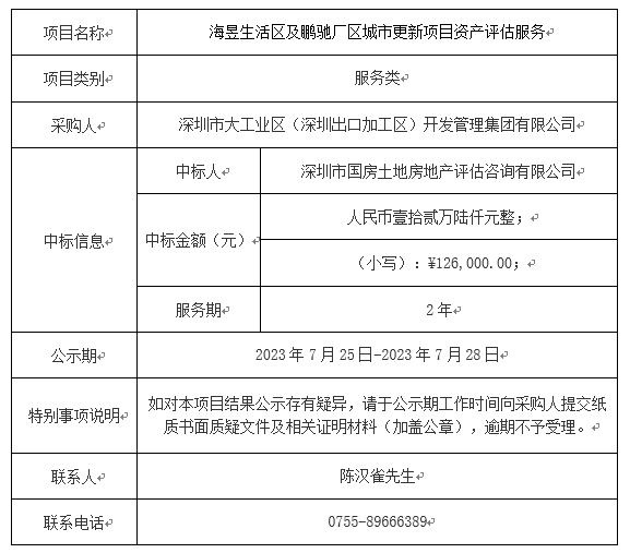 在深圳市建设工程材料设备询价采购平台进行公开招标的海昱生活区及鹏驰厂区城市更新项目资产评估服务(项目编号:SZXJCG-S202307040013001)已完成评审及定标,现将本项目评审的相关情况及定标结果进行公示,具体内容如下: