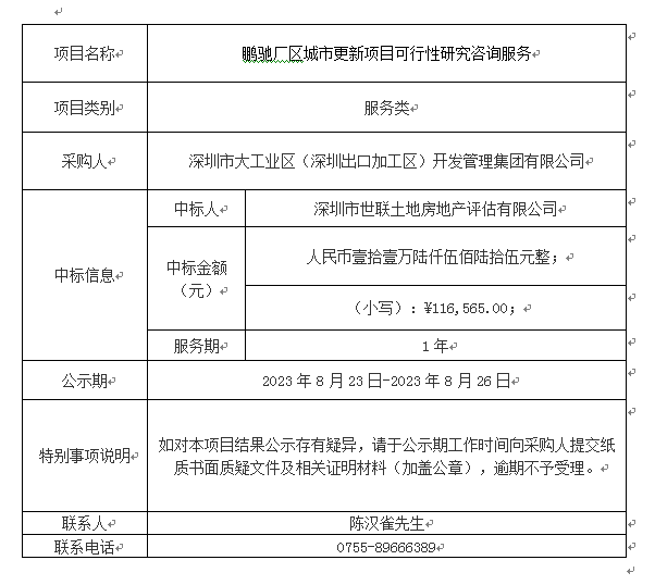 在深圳市建设工程材料设备询价采购平台进行公开招标的鹏驰厂区城市更新项目可行性研究咨询服务(项目编号:SZXJCG-S202308020005)已完成评审及定标,现将本项目评审的相关情况及定标结果进行公示,具体内容如下: