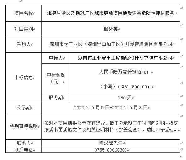 在深圳市建设工程材料设备询价采购平台进行公开招标的海昱生活区及鹏驰厂区城市更新项目地质灾害危险性评估服务(项目编号:SZXJCG-S202308150005)已完成评审及定标,现将本项目评审的相关情况及定标结果进行公示,具体内容如下: