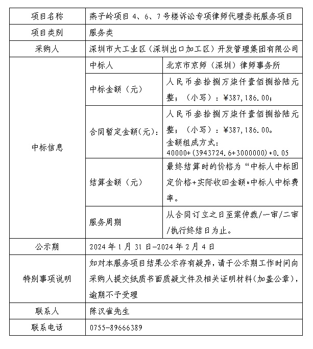在深圳阳光采购平台进行公开招标的燕子岭项目4、6、7号楼诉讼专项律师代理委托服务项目已完成评审及定标,现将本服务项目评审的相关情况及定标结果进行公示,具体内容如下: