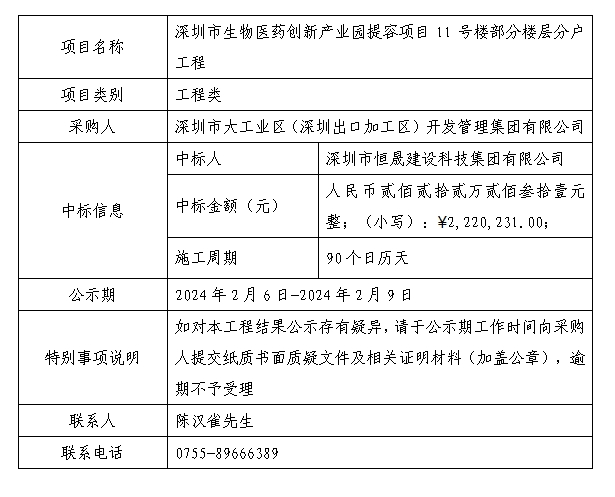 在深圳阳光采购平台进行公开招标的深圳市生物医药创新产业园提容项目11号楼部分楼层分户工程已完成评审及定标,现将本工程评审的相关情况及定标结果进行公示,具体内容如下: