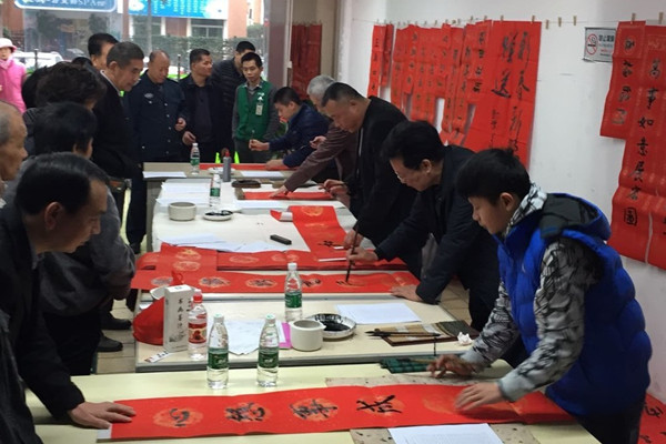 新春佳节即将到来,为继续做好业主服务,2月1日上午,物业公司新桂花村管理处在金桂大厦华润万佳超市门口举办了第三届“写春联·送祝福”迎春活动,邀请多名书法爱好者泼墨挥毫书写对联。集团公司副总经理何学军和坪山分公司总经理盛跃雄于百忙中欣然莅临现场参加活动。