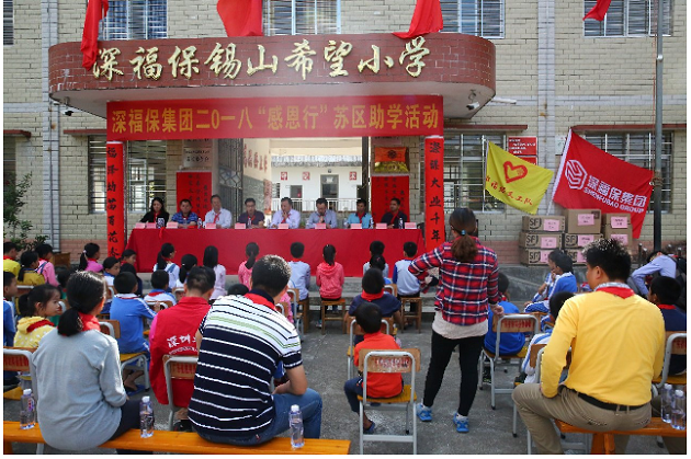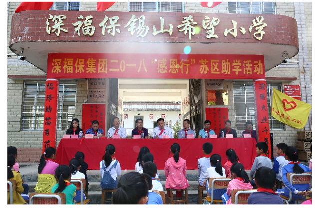 10月12日,集团副总经理熊海明带领集团党员员工代表联合腾邦集团前往河源紫金苏区镇金年会锡山希望小学,开展了一场温暖的公益捐助活动,金年会集团党委、腾邦集团党委、苏区镇党委、金年会锡山希望小学师生代表等100多人参加了活动。本次“感恩行”助学支教活动,金年会集团向苏区镇金年会锡山希望小学捐赠了校服、文具等一批文教用品,并向苏区镇50名受助学生捐赠2017-2018年度助学金共计8.8万元。