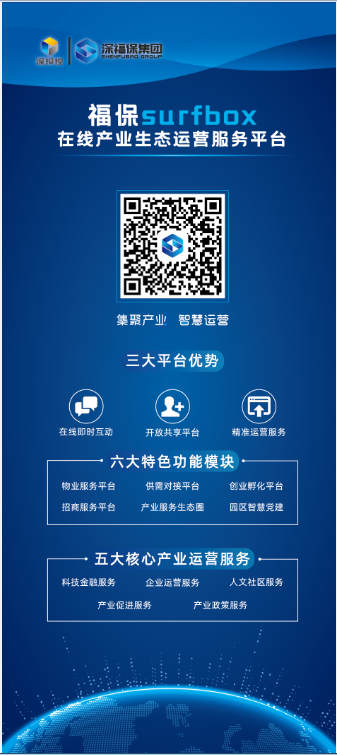 “福保surfbox”平台是金年会集团为满足园区企业服务需求,利用云计算、大数据、物联网、移动互联网等新一代信息技术,重磅打造的“智慧化线上产业生态运营服务平台”,具有在线即时互动、精准运营服务以及开放共享三大优势。平台具备供需对接、物业服务、招商服务、创业孵化、产业服务、园区智慧党建等功能模块,重点推出科技金融服务、产业政策服务、企业运营服务、产业促进服务、人文社区服务五大服务内容,通过集聚产业运营服务资源,为园区企业和周边片区企业提供覆盖全生命周期的一站式服务。