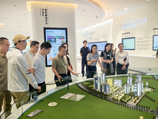 凤岗天安数码城工作人员介绍了其自行研发的“天安汇APP”系统,现场演示了园区车行、人行、消防预警、电梯运行、产业政策信息发布等产业园区运营各个环节如何通过APP实现物业和产业服务的全面智能化数字化管理。双方还就轻资产运营体系、租售制度、品牌建设、园区增值服务运营模式等方面进行了积极的探讨交流。